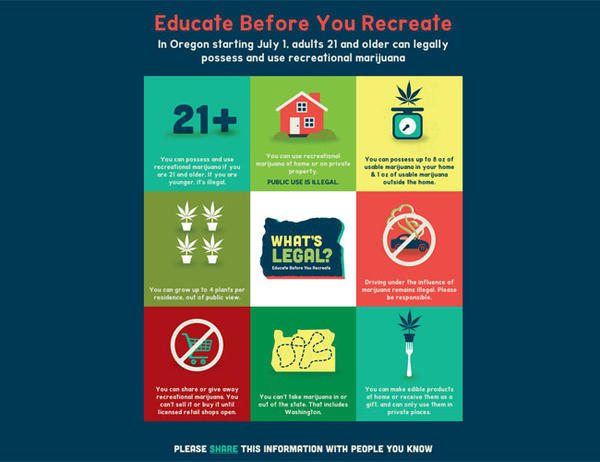 The ad campaign is aimed at 18-to-35 year-olds. It uses social media and commercials. One ad says, “Starting July 1, adults 21 and older in Oregon can possess and use recreational marijuana at home or on private property. But public use is still illegal.”
